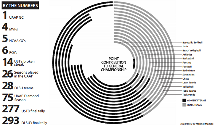 Last season, DLSU almost stole the crown from UST, which only had a 10-point lead after the first half. DLSU, in the second half however, gave UST another 10 point lead as the squads came up short in the latter part of the season.
